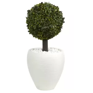 Nearly Natural 26 in. High Indoor/Outdoor Boxwood Topiary Artificial Tree in White Oval Planter