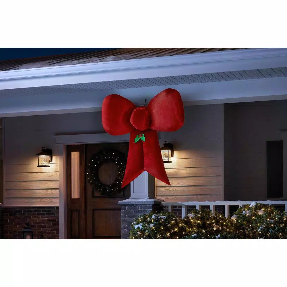 Bring holiday happiness to passersby with this Airblown Inflatable Christmas bow. Featuring soft, velvety red fabric, it includes a loop for hanging and an external spotlight that stakes into the ground. Use it as a standalone piece or group it with other inflatables for a supersized scene. Setup is easy – just plug it in, stake it down and enjoy the fun. Includes everything needed for outdoor setup.