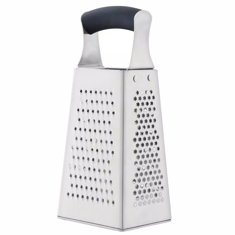 9″ 4-sided square grater with top handle. Perfect for grating and shredding cheeses, vegetables and more! Everyone loves to have options when it comes to grating, not too big, nor too small. You can choose any style that suits your needs. This classic look will fit any decor for a great addition to your kitchen tools!