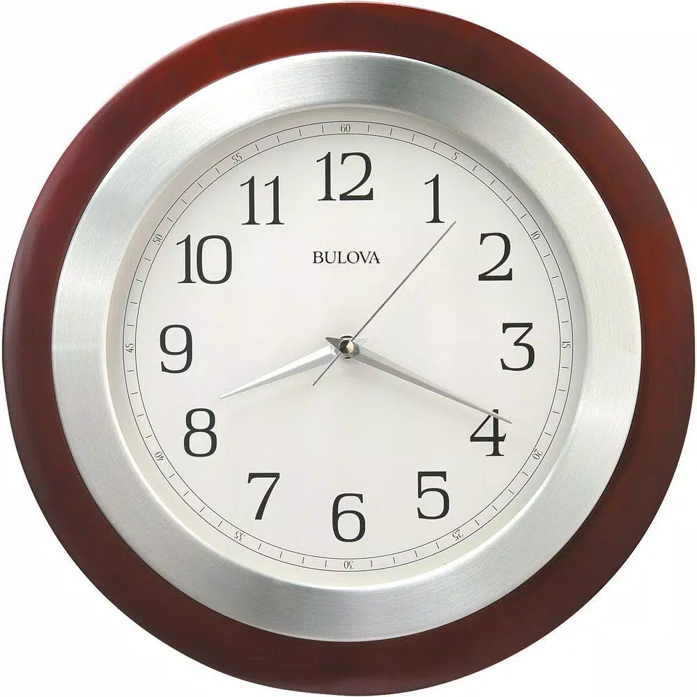 The Reedham is a 14 in. H round wall clock with a solid wood case in a walnut finish. The brushed aluminum bezel has transitional Arabic numerals and silent quartz movement with a smooth silver sweep second hand. The convex lens adds to the unique look of this clock.