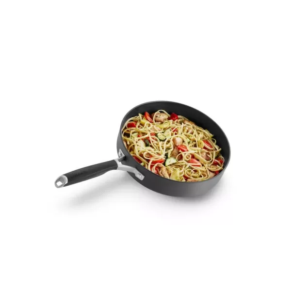 The Select by Calphalon Hard-Anodized Nonstick 3 Qt. Saute Pan is designed for easy meal preparation any day of the week. Crafted from hard-anodized aluminum, this saute pan is durable for everyday cooking and distributes heat evenly so your recipes turn out beautifully. From batches of chili to sauteing vegetables and searing chicken, the nonstick interior allows for easy food release and makes cleaning a breeze. The wide, flat bottom gives you room to cook, while straight sides help minimize splattering. Comfort-grip handles stay cool on the stovetop and give a secure hold, so pans go from the stovetop to the oven with ease and confidence. Includes tempered glass cover. Pan and glass cover are oven safe.
