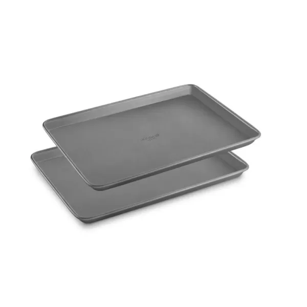 The Select by Calphalon Nonstick Bakeware 12 in. x 17 in. Jelly Roll Pan Combo Set has the baking pans you need to make delicious cookies, sheet cakes and sponge cakes, or even roast vegetables. The durable, nonstick finish allows desserts to slide right off for easy release. The bakeware features rolled edges for durability and resistance to warping. Made from aluminized steel, heat is consistent throughout the pan, giving you perfect results. Jelly roll pans are similar to cookie sheets, with shallow sides to help contain ingredients or juices. Dishwasher safe for easy cleanup. Set includes (2) 12 in. x 17 in. Jelly Roll Pan.