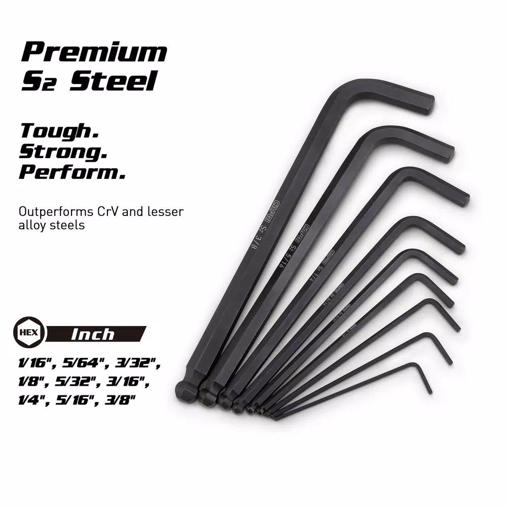 - 9 SAE sizes: 1/16, 5/64, 3/32, 1/8, 5/32, 3/16, 1/4, 5/16, 3/8 in.
