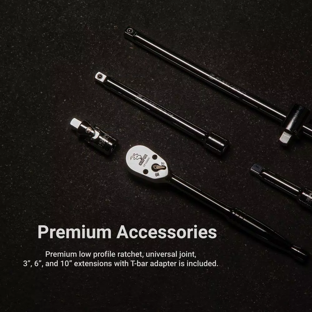 - Comes with our 3/8 in. drive low-profile 72-tooth fine gear ratchet, 3 in., 6 in., 10 in. extension bars and a universal joint