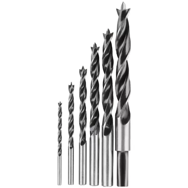 The 6 bits that comprise the DEWALT 6-Piece Steel Brad-Point Drill Bit Set feature precise cutting edges that help limit splintering. Each steel bit uses brad-point tips and engineered flutes to help prevent drill walking and remove chips. Set includes 1/8 in., 3/16 in., 1/4 in., 5/16 in., 3/8 in. and 1/2 in. bits.