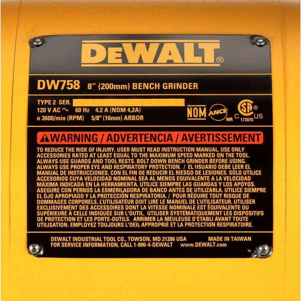 - Includes DW758 bench grinder, 36 and 60-grit wheels, eye shields, spark deflectors, tool rests and manual
