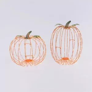 Add an illuminating touch of autumn to your seasonal decor with this pair of electric pumpkins that glow with warm LED lights. You get 2 styles of metal orange pumpkins that easily collapse and assemble with the fastener, allowing you to easily store these away flat when not in use. The pretty green variegated metal leaves, curly vine and stems are a beautiful contrast to the orange and give you a handle to move or carry these pumpkins. Light weight, you can even hang them. Warm up your chilly nights with these pumpkins that can stay in your decor for months.