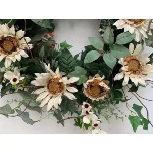 - Artificial white cream sunflowers, green silk leaves are securely attached to a grapevine twig base