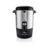 The Hamilton Beach Fast Brew Coffee Urn brews coffee 30% faster, reducing wait-time for your guests. The urn makes 15-45 cups of coffee, and brews 45-cups in just 28-minutes. The urn features dual heaters to keep coffee hot without overheating. The ready light illuminates to let you know when the coffee’s ready to serve. The urn is also great to use for hot tea and other drinks. Coffee is easy to pour from the urn using the easy-press lever, which is activated at the push of a cup making it easy to pour coffee using just one hand. The urn easily dispenses coffee into any kind of cup, even disposable cups. Clear water level markings in the urn’s water/coffee level window make it easy to see how much water you’re adding or how much coffee is left in the urn. The removable coffee filter basket lifts from the urn and is easy to clean in the dishwasher. No paper filters are needed. The brushed finish looks great with every decor and resists fingerprints. The handles stay cool to the touch for comfort, and the lid on the large coffee maker locks in place to eliminate spills.