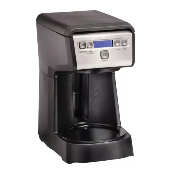 The Hamilton Beach 12-Cup Compact Programmable Coffee Maker is a large-capacity coffee maker nestled in a small compact design packed with features. It’s perfect for small kitchens or any place where you’d like to conserve space. It easily fits under kitchen cabinets with room to spare and features top-mounted controls that are easier to see and use. Programming is simple, too. Easy-Touch programming lets you set the coffee maker up to 24-hours ahead for fresh, hot coffee when you wake in the morning. Customize the strength of your coffee to suit your tastes with the Select-a-Brew brew-strength selector. Auto pause and pour stops the flow of coffee when you lift the carafe away from the coffee maker to pour a cup of coffee before the brewing stops without making a mess. The coffee maker automatically turns off after 2-hours for added peace of mind. The 12-cup glass carafe holds plenty of coffee for serving a large family or group. It’s designed for mess-free, easy pouring. And the transparent water-level window has clear level markings so you can easily see how much water you’ve added. The sleek black and stainless steel design complements any decor.
