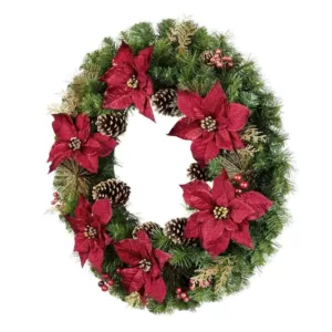 Liven up your decor with this Mixed Pine Wreath by Home Holiday Accents. Featuring burgundy velvet poinsettias with berries, pine cones and gold glitter cedar, it adds the perfect festive touch. Display it above your fireplace mantel or entryway or hang it on your door. Rated for indoor and covered outdoor use.