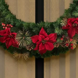 Liven up your decor with this Mixed Pine Wreath by Home Holiday Accents. Featuring burgundy velvet poinsettias with berries, pine cones and gold glitter cedar, it adds the perfect festive touch. Display it above your fireplace mantel or entryway or hang it on your door. Rated for indoor and covered outdoor use.
