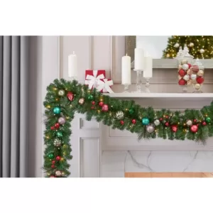 Light up the holidays with this 9 ft. Pre-lit Fantasleigh Decorated Garland from Home Accents Holiday. Illuminated with 50 battery-operated warm white LED lights, the natural-looking garland is pre-decorated with red, gold and green ornaments. It’s perfect for above an entryway, fireplace or stairway rail. This garland has a timer function, is rated for indoor and outdoor covered use and uses 4 AA batteries (not included).