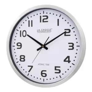 La Crosse Technology 20 in. Atomic Analog Wall Clock 404-1220. Stylish and functional all in one. Extra large metal indoor atomic wall clock. Brushed aluminum case, bold black Arabic numbers at all hours and black metal hands. Atomic time with (manual setting option), automatically sets to exact time and is accurate to the second.