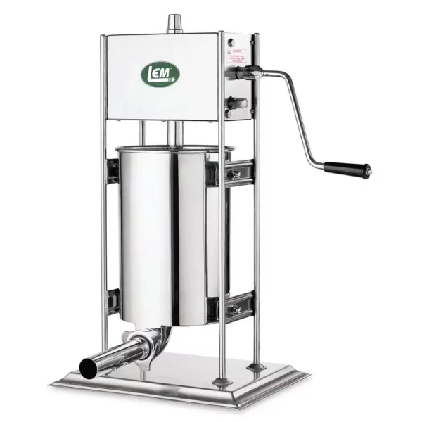 The new 90° handle gives you greater leverage and makes cranking easier. The huge drive gear, notched piston rod and hard carbon steel gears are built to withstand the pressure needed to stuff even small sausages. Four solid Stainless Steel bars create a sturdy frame. Two speed design; high speed raises the piston quickly for filling the cylinder, low speed is for stuffing casings. Air release valve in piston ensures even pressure and better results. Heavy-duty rubber gasket prevents leaks. Stainless Steel cylinder is removable. Mounting holes in base. Includes 4 Stainless stuffing tubes.