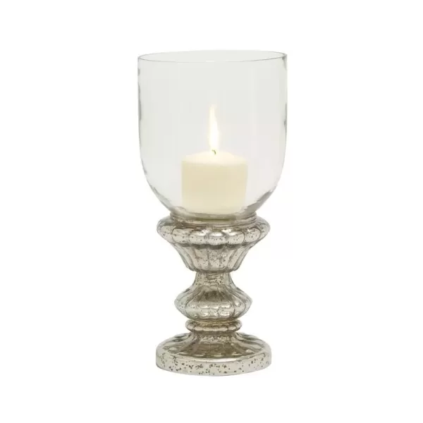 - 14″ Rustic Elegance pedestal hurricane glass candle holder, tarnished silver-finish glass, fluted pillowed tapered pedestal with round flat base, top clear hurricane glass cup-style candle holder
