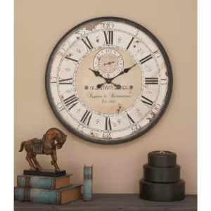 For an antique-inspired touch to your home, look no further than this 32 in. Round Rustic Black Iron and Wood Antique Roman Numeral Wall Clock. Each clock features textured dark brown brush strokes with a distressed creme and beige wood face. It is perfect for any bedroom, living room, office or kitchen with a rustic, shabby chic, or farmhouse look.