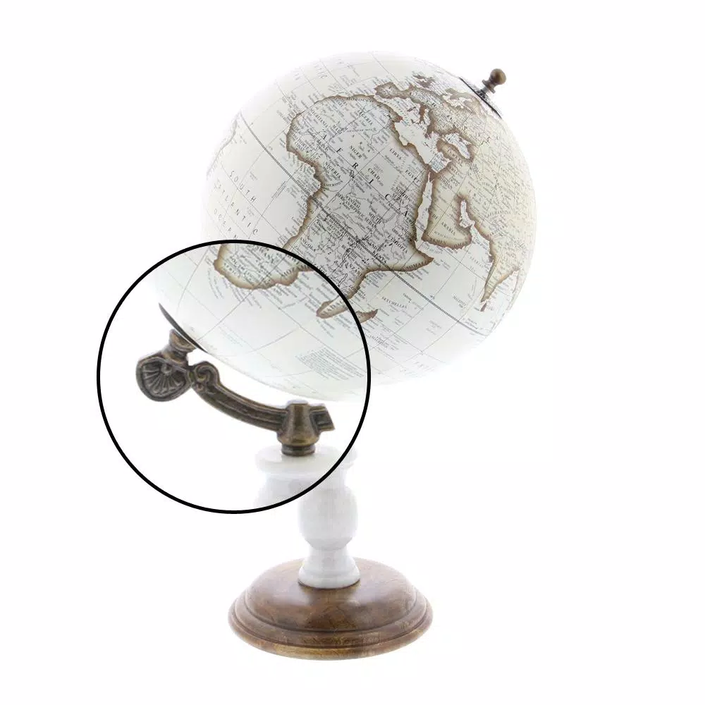 This plastic globe features a dainty white surface with matching ornate iron mount in a tarnished brass finish perfect for traditional settings. It features a clean illustration of the world map in gradient brown outlines and black typographies against a vintage white background. This decorative piece is designed with an elegant marble stand attached to a dome-shaped wooden base that is sure to complement your vintage desks, tables or shelves.