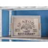 - Set of Two 13″, 15″ Coastal Living wood tray, two wooden trays with white smoothed MDF finish, features light brown interior accent with gray sea shell print, blue “SEAFOOD FRESH TASTY” text details, light brown ropes tied on each handle