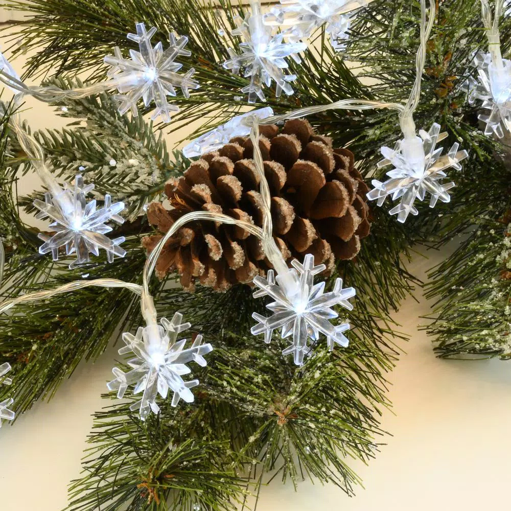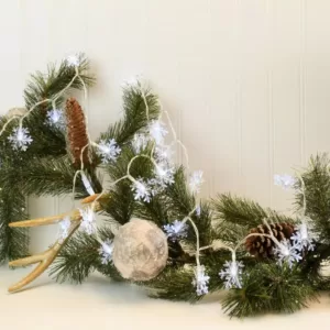 This set of 2 mini battery operated string lights each have 40 cool white LED lights with a 1.25 in. x 1.25 in. translucent molded snowflake on a ultra-thin bendable wire. They add a festive touch to your holiday decor. Bring a chic illumination to a mantle, table settling, wreath, centerpiece or any water feature.