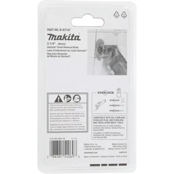 The Makita 3-1/4 in. Starlock Grout Removal Blade is engineered for cutting smaller cutouts in soft wall tile. This blade is ideal for removing grout or thin-set for tile repair and removing hard caulking or hardened glue. The tungsten carbide edge provides increased performance and longer accessory life. The Starlock Interface is compatible with most oscillating multi-tools (sold separately).