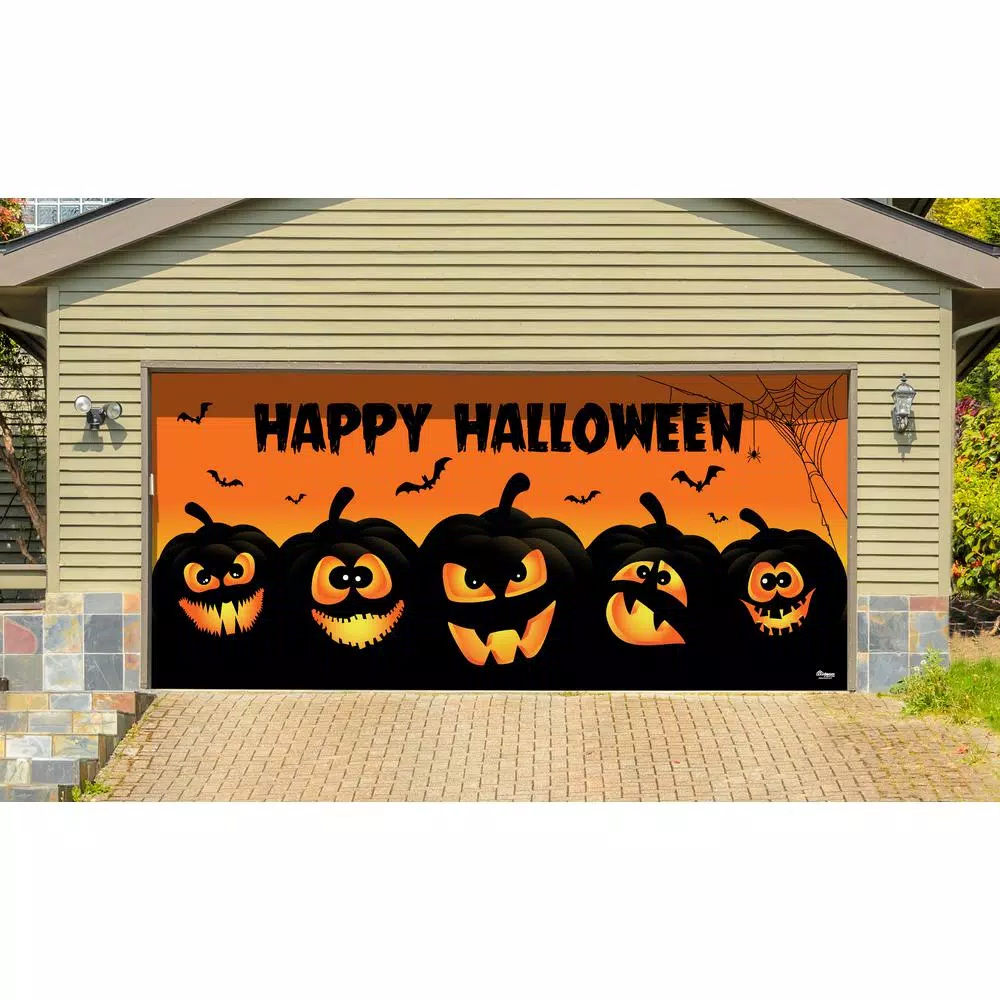 Halloween Garage Door Banner Mural Sign decor 7 ft. x 16 ft. Car Garage – The Original Holiday Garage Door Banner Decor by My Door Decor, makers of My Door Decor. Proprietary components for easy assembly, allowing door to open and close without hurting the integrity of the door. Huge selection of holiday themes at My Door Decor. Garage Door Decor is manufactured to fit roll-up (sectional) paneled garage doors, as well as canopy (flat) garage doors. We’ve developed a system that makes installation quick and easy. This system requires no tape or screws, which could potentially damage your garage door. Instead, our hardware consists of a hook attachment that goes over the top of the garage door and a tension hook at the bottom. The top hook attachment protects your mural from theft by keeping it securely held behind the frame of the garage door. The tension hook keeps the mural taut when the garage door is closed and protects it from wind damage by flexing with the mural. Each garage door banner is ready to hang with minimal assembly. 2-people installing a single mural should take about 10-minutes. Every banner, whether it’s for your front door or garage door, comes with assembly hardware so it can be installed right out of the box.