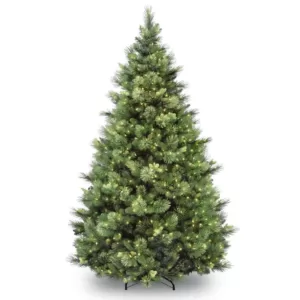 This Carolina Pine tree features mixed bristle and cashmere branch tips and is trimmed with flocked pine cones. It is pre-strung with 700 clear lights that remain lit even if a bulb burns out. This three section tree features hinged branches for ease of assembly. Sturdy folding metal tree stand is included.