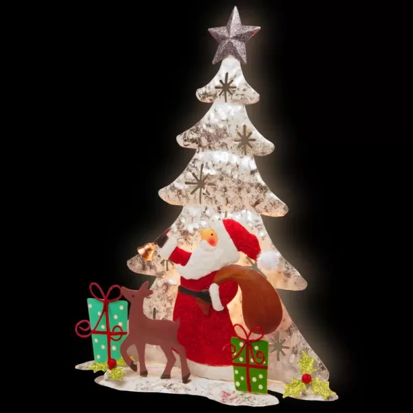 This handcrafted decoration creates a holiday scene featuring Santa, his reindeer, and holiday gifts in front of a glowing tree. This sculpted piece is constructed of metal and wire components painted in a distressed finish. The tree is lit from behind with battery operated warm white long lasting LED lights.