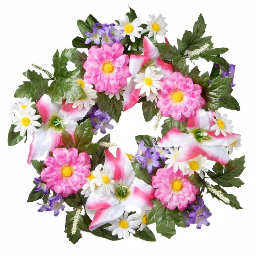 This bright and colorful wreath features blooms of pink daisies and white tiger lilies that are mixed with contrasting green leaves for a natural appearance. Display this spring and summer season decoration on doors, walls and windows in indoor or covered outdoor locations.