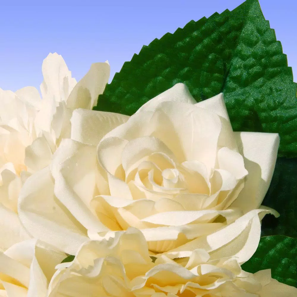 This bouquet features large cream color rose and peony flowers blooming from a contrasting green leaf base atop long rigid stems. The stems are tied with lace ribbon at the bottom and with a bow at the top. Use as a bright and beautiful flower grouping for bride or bridesmaids to carry, or as a creative table decoration.