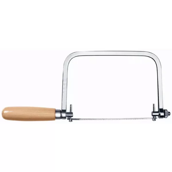 Olson Coping Saw with Unique Blade Tensioning End Screw is a sturdy, professional saw that allows standard pin end coping saw blades to be tensioned at both ends (using the handle and thumb screw) for more precise cutting of intricate and irregular shapes with complete control. Blades can be turned 360° to saw in any direction push or pull stroke. Depth of cut is 5 in. Hardwood handle. Equipped with Olsons 15 TPI blade.