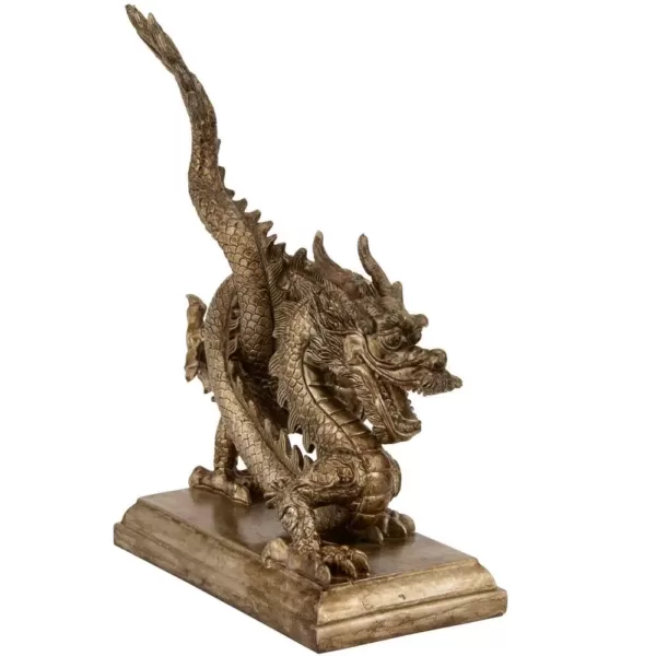 This fearsome dragon sculpture is a beautiful resin reproduction of the famous creature from Chinese mythology. Symbolizing power, strength, and good fortune, the dragon is an auspicious symbol historically associated with the emperor of China. This statue shows a dragon in a defensive stance, his serpentine body coiled and ready for a sudden attack. Featuring a metallic finish, this ornate statue is suitable for display on a shelf, table, or counter. This powerful guardian will add a royal touch to your décor, and might even bring a little luck to your home or business.