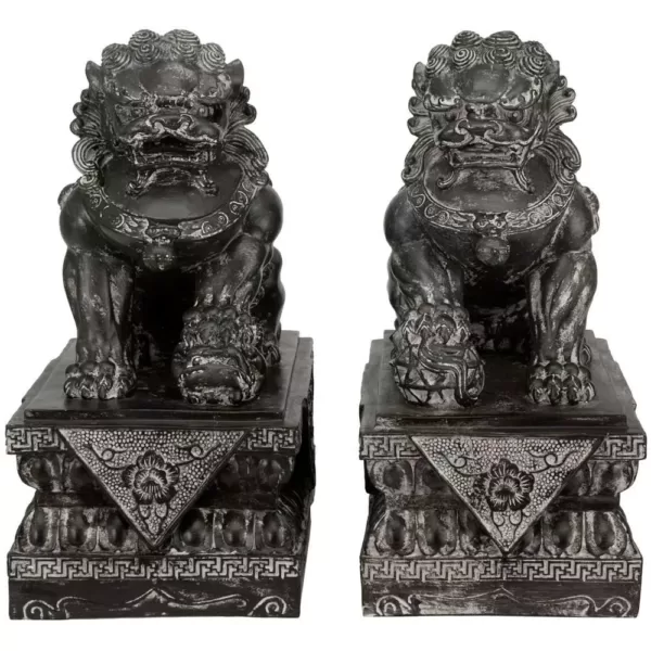 Carefully detailed in high quality resin, these “Foo Dog” sculptures are reproduced from authentic Chinese originals. Despite the name they have gained in the West, these statues actually represent guardian lions and were traditionally placed on either side of an entranceway for protection and good fortune. Always appearing in pairs, the male lion clutches a terrestrial orb to symbolize his power while his matching mate holds a playful cub in a gesture of nurturing love.