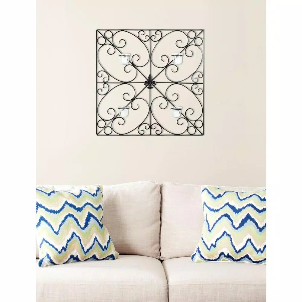 The geometry of this square votive wall piece gets softened by the subtle sweep of wrought iron scrolls. A fleur de-lis medallion at the heart of the sconce and four glass candle holders are the final flourishes. Perfect for any home décor, this is a great addition for your home whether you live in the country side or the busy city.
