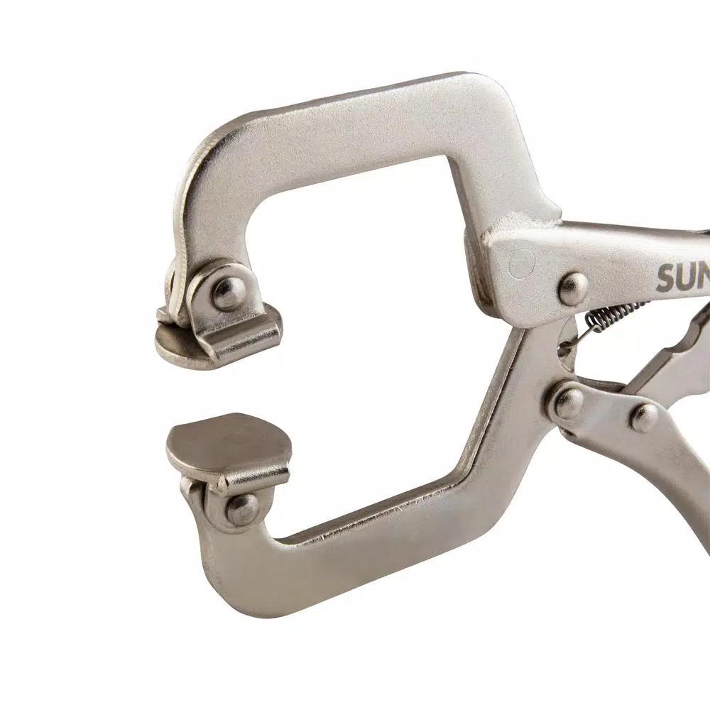 The Sunex LC6S 6 in. Locking C-Clamp with Swivel Pads has a 3-3/8 in. Jaw capacity and is great for body work and welding applications where a wide opening is needed. The wide-opening jaws provide versatility when clamping a variety of shaped materials. The trigger release handle allows for easy loosening of the grip.