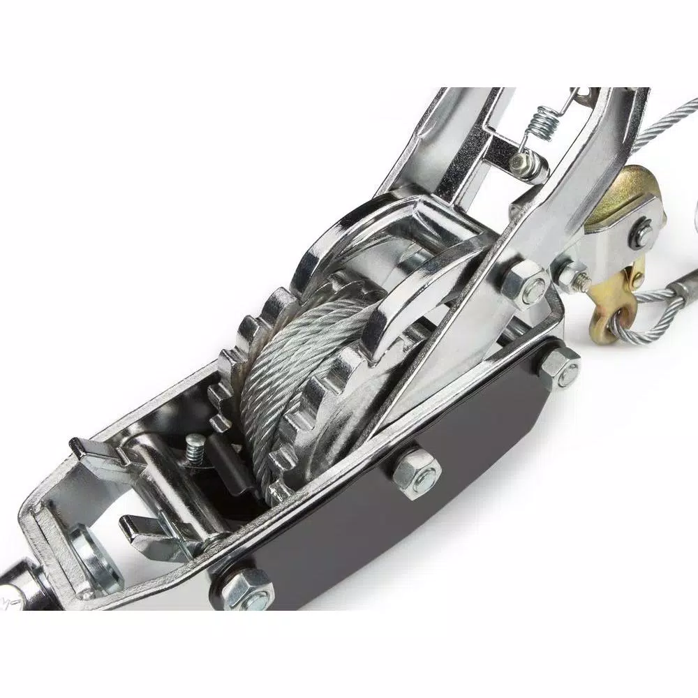 - Ratcheting gear pulley system allows for 1 handed effort to pull heavy loads