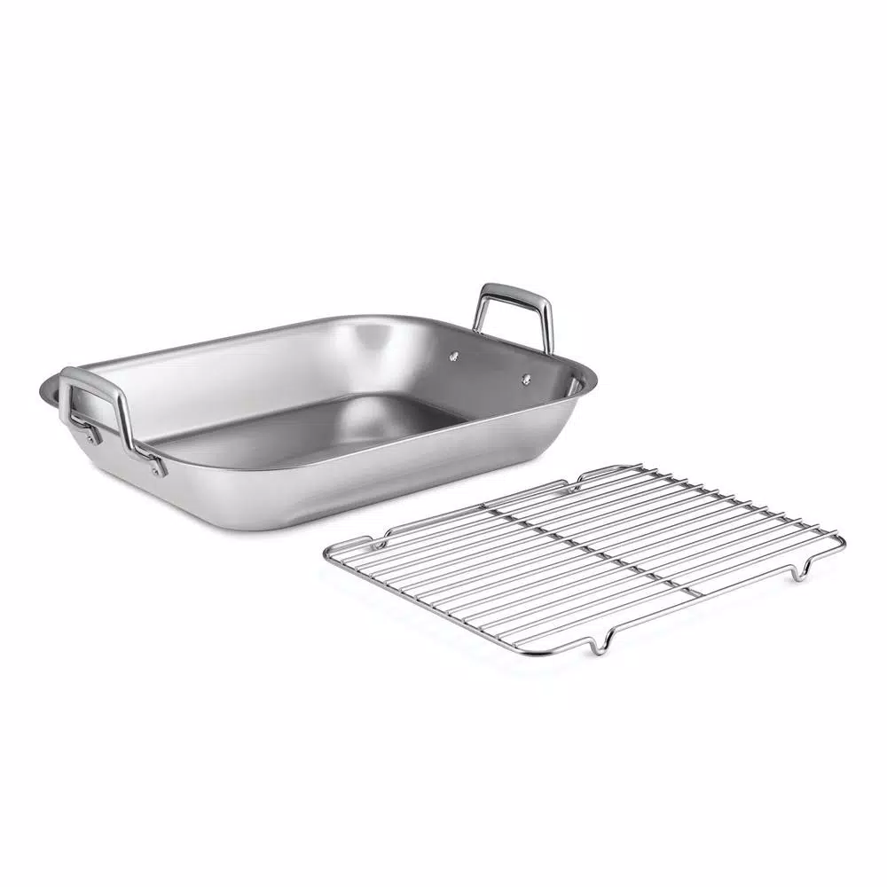 The Tramontina Gourmet Prima Stainless-steel Roasting Pans with basting rack are great for everyday meals and elegant feasts, these handsome, hardworking pans make it simple to prepare everything from perfectly roasted meats, poultry, potatoes and fresh vegetables. The premium restaurant-quality 18/10 stainless-steel construction is long-lasting while the heavy-duty, stainless-steel mirror-polished handles are riveted for extra durability. The ow flared-edges promote even cooking and add a great look for your kitchen. Roasting pan includes removable electro-polished stainless-steel basting rack. Part of the TRAMONTINA GOURMET collection, which features timeless products crafted especially for the cooking enthusiast. Made in Brazil, assembled and packaged and offered under lifetime warranty.