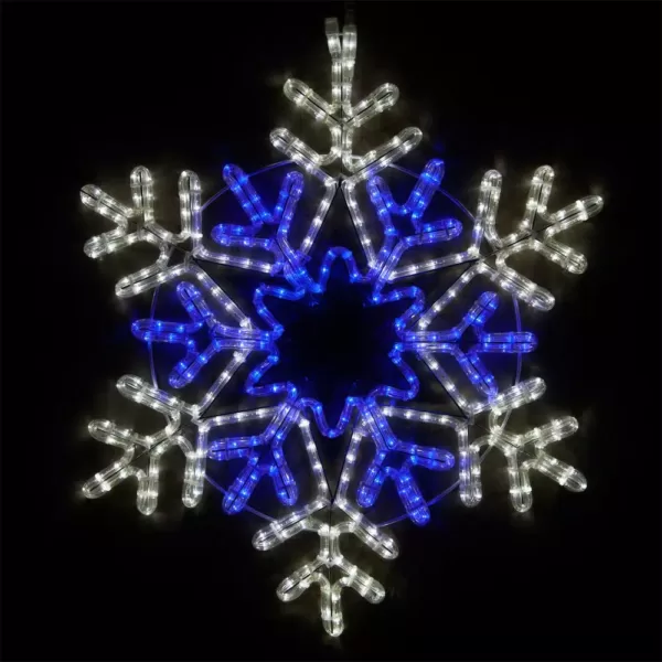 This breathtaking blue and white LED snowflake decoration will be the highlight of your holiday displays this year. Like a snowflake with a snowflake, it glows with 407 LED lights in blue and cool white. The long-lasting, energy efficient LED mini lights are encased in UV resistant PVC tubing and strapped to a sturdy metal frame, so this snowflake will keep shining brightly even through the darkest nights. And its long 6 ft. lead cord is ideal for hanging display. Perfect for hanging from trees, fences or other exterior surfaces. Stand out from the crowd with this 28 in. snowflake, perfect for any setting.